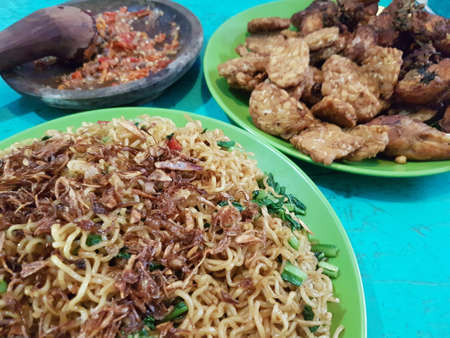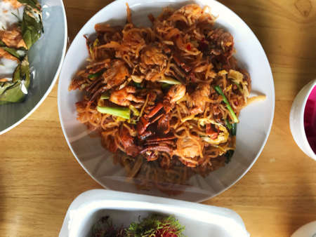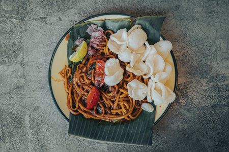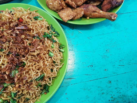 Mie Aceh. Stir-fried spicy noodles from Aceh, Indonesia. Flat lay, overhead, or top view angle with the object in the center.