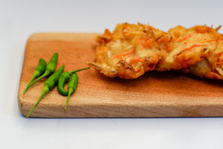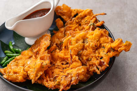 Bakwan sayur or bala-bala or vegetable fritter, Indonesian snack made from flour, shrimps, cabbage, carrots and bean sprouts, served with green chili