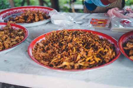 Pork snack, pork rind, pork scratching, pork crackling, thai street food market