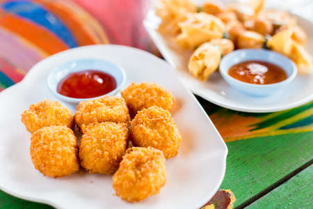 Deep fried chicken nuggets with ketchup on a colored wooden table