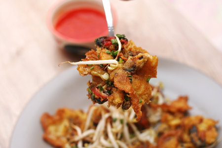 Oysters fried in egg batter, Pan-fried crispy mussel with bean sprout, Crispy Mussel and Beansprout Pancake