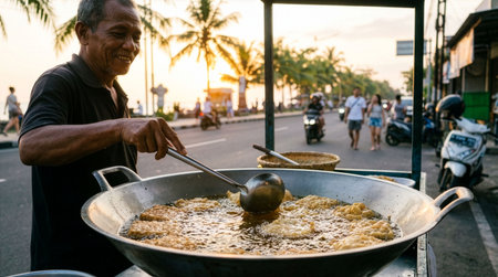 various kinds of traditional Indonesian street food fries, the seller uses tong tongs to select and pick up the fried foods before inserting the plastic bag