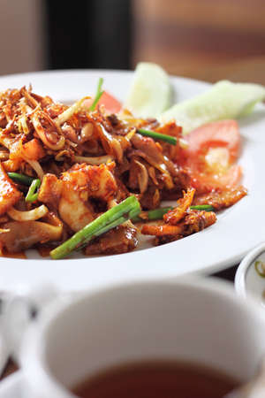Kwetiaw or Kwetiau is Chinese food which is popular in Indonesia, cooked by frying added with chicken, seafood and complementary vegetables. Served in white plate, selective focus.