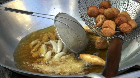Potato pancakes fried in boiling oil. Street food in India. Indian cuisine. Vegetarianism