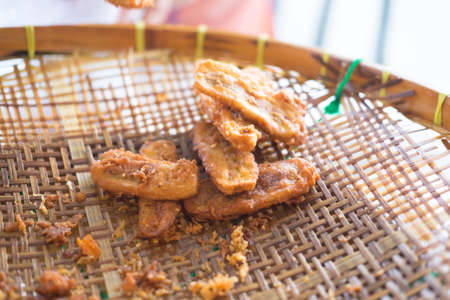 Close up of fried bananas on rattan tray. A traditional food in some places in south east asia.