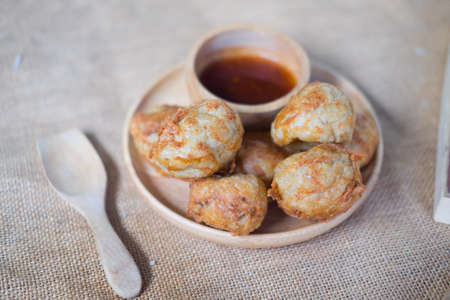 Thai cuisine of fried fishcake (Tod Mun Pla) on wooden dish