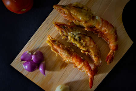 fried shrimp served with tomatoes, shallots, garlic with cutting board on black background