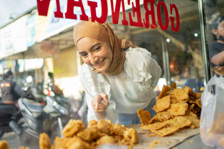 a beautiful girl in a veil with finger pointing while choosing fried food on a roadside cart. Gorengan is indonesian word mean fried snack