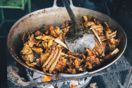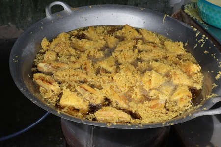 Thai style fried chicken in a pan on the street in Thailand