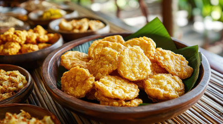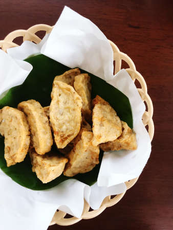 various kinds of food, fried tahu walik on a serving plate on the table