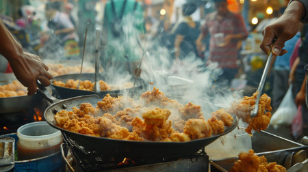 A street food vendor frying batches of crispy chicken in a busy marketplace, filling the air with the enticing aroma of fried goodness.