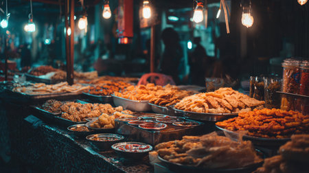 Immerse yourself in a vibrant night market scene filled with a variety of street food and local delicacies. Enjoy the warm glow of lights as vendors showcase colorful dishes.