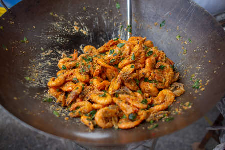 Prawns being deep fried inside a wok at Penang Malaysia