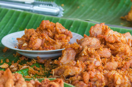 Fried crispy pork belly recipe on banana leaf