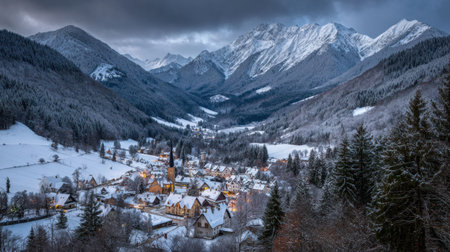 A village blanketed in snow with light shining from windows. Surrounding mountains add to the winter scene as clouds drift above.