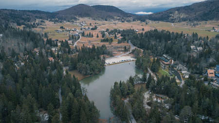 Aerial drone view of Rakitna lake in central Slovenia, famous for its lake and marshes in the middle of the winter on a cloudy day.