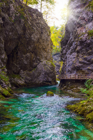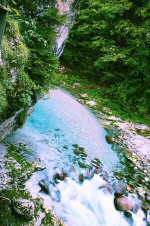Slovenia. Vintgar gorge. Mountain river with azure water. Bubbling and roaring foamy rapids, rocks and rifts.