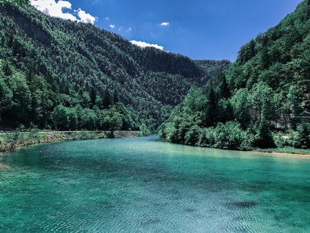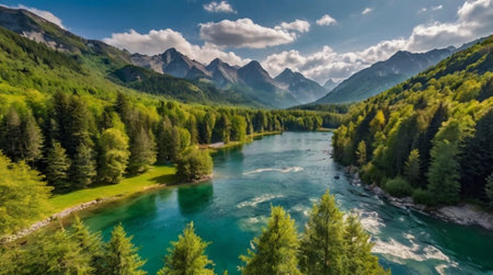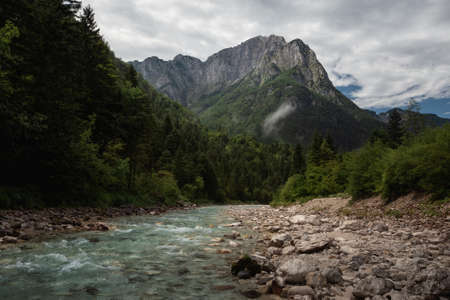 Beautiful morning nature scenery with SoÄa river, forest and mountains in Slovenia