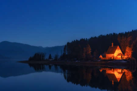 Bavaria, Walchensee, March 2019. A beautiful night landscape with a view of an illuminated wooden church located on the shore of a mountain lake in the Alps