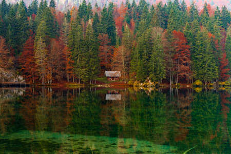 Autumn scenery at lake Fusine ( Lago di Fusine) mountain lake in north Italy in the Alps.