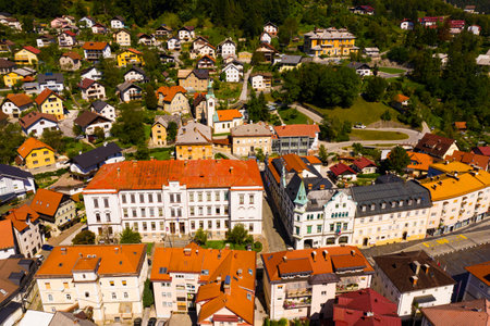 Panoramic view of small Slovenian town Idrija on sunny day