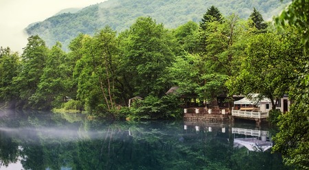 fog creeps over the water of Lower Blue karst Lake Kabardino-Balkaria Republic