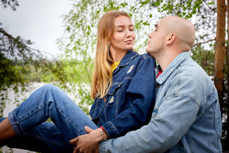 Kirov, Russia - June 22, 2020: European couple of blonde woman and bald man walking at park, enjoying and being happy together. Love and tenderness concept. Lovers on date outdoors at nature