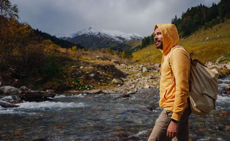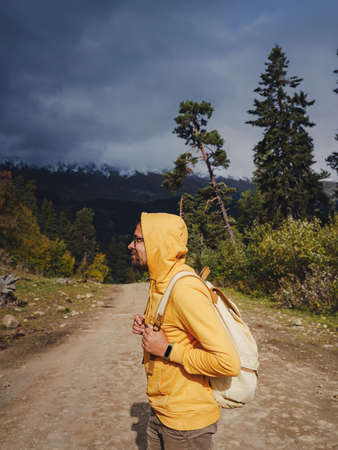 Man hikes mountains with travel backpack. Wandering lifestyle, adventure concept autumn vacation outdoors, alone in wild. Travel to North Caucasus, Arkhyz, Russia