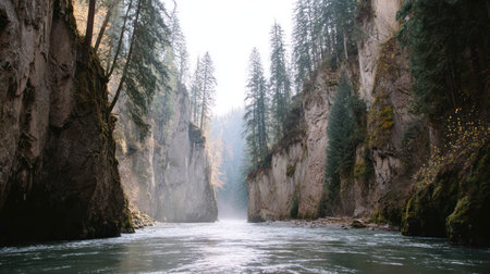 Explore a serene canyon enveloped in mist, featuring calm waters and rugged cliffs. This tranquil landscape invites adventure and reflection in nature.