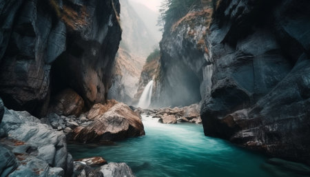 AI Generated. Majestic river flows through a rocky gorge surrounded by towering cliffs and lush greenery in the early morning light
