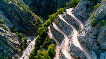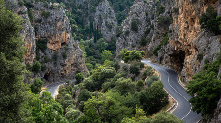 Winding mountain road cuts through a dramatic landscape with natural beauty.