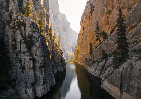 Wide river flowing rapidly through a deep canyon, bordered by steep, rugged rock walls and scattered evergreen trees. sunlight illuminates the natural landscape.
