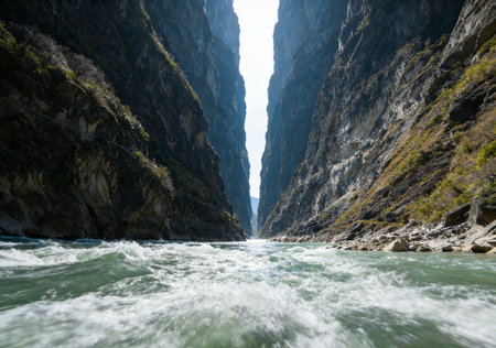 A fast-flowing river carves through a narrow canyon, revealing the rugged beauty of the mountain landscape.