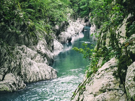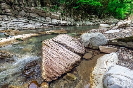 Panoramic view of blue river water flowing in rocky gorge in Yew and Boxwood Grove of Khosta, Sochi, Russia