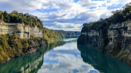 Serene canyon mirrored in a tranquil river with lush greenery. Calm gorge reflected in clear water with vibrant plants. Concept of natural beauty, tranquility, outdoor scenery, reflection, nature.