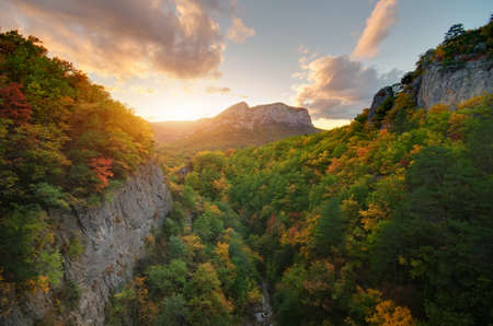 Scenic panoramic view on a mountain valley canyon cliffs and stone river trail. Landscape with mountain ridges, rocks covered with greenery.