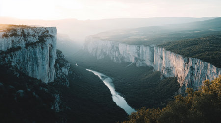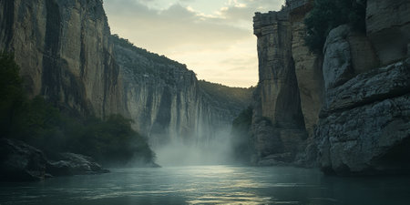 AI Generated. Majestic river flows through a rocky gorge surrounded by towering cliffs and lush greenery in the early morning light