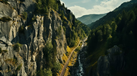 High-altitude shots of a railway cutting through dense forests and rocky cliffs in the mountainous terrain. Generative AI