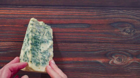 Flat lay. Large wedge of blue cheese on a dark wooden background.