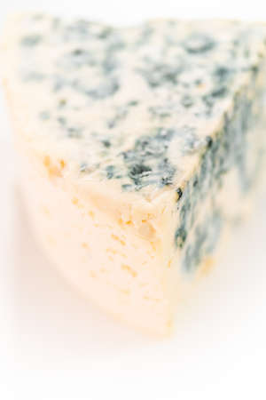 A piece of blue cheese. Isolated on white. Selective focus.