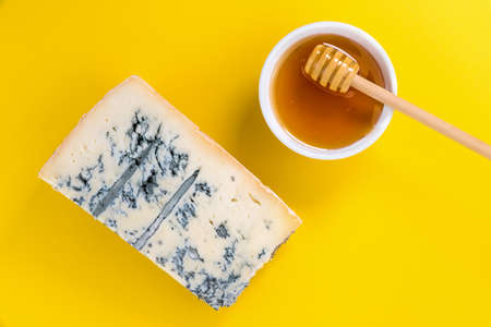 Italian gorgonzola cheese, blue mold cheese slice with honey bowl with wooden dispenser on yellow background, top view, flat lay, copy space