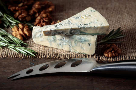 Blue cheese with walnuts and rosemary on an old wooden table.