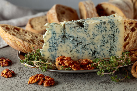 Gorgonzola with ciabatta, walnuts, and thyme on a gray stone table.