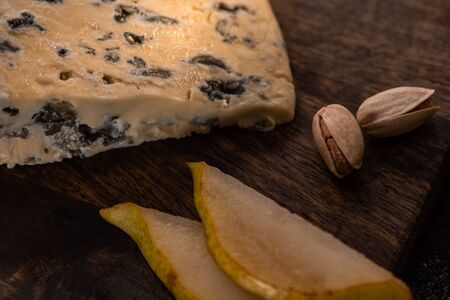 Italian food, buttery or firm blue cheese made from cow milk in Gorgonzola, Milan, Italy close up