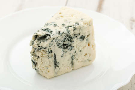 Blue cheese on a white plate on a wooden background.