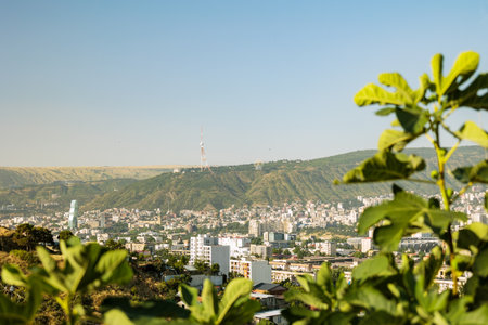 Morning panorama of Tbilisi, Georgia, with Mtatsminda TV Tower and hillside skyline framed by soft-focus fig leaves under a clear summer sky