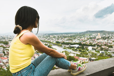 Attractive thoughtful female person sit on Narikala castle wall an enjoy view of Tbilisi city. Georgia travel destination