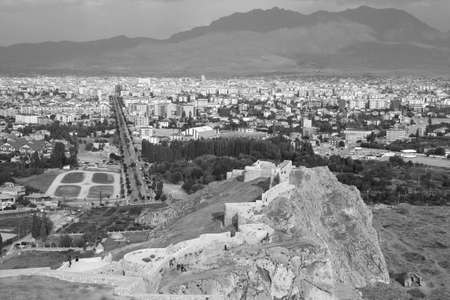 Black and white panorama of the city of Van against the background of the mountains with part of the castle of Van on a high cliff in the foreground in the Eastern Anatolia region