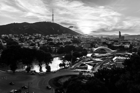 Black and white view of glass Bridge of Peace in old Tbilisi at sunset, Georgia, Europe