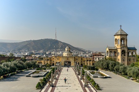 View of the Holy Trinity Cathedral Tsminda Sameba in Tbilisi, Georgia. Travel.